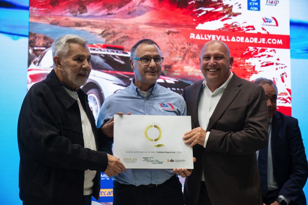Durante la presentación, la directora del Instituto para la Calidad Deportiva Española, María África Álvarez, entregó a Poli Delgado, máximo responsable de la organización del Villa de Adeje, el documento con el que el Instituto Internacional de Excelencia y Certificaciones Deportivas distingue al Rallye como evento certificado con el Sello de Calidad Deportiva 2026.
